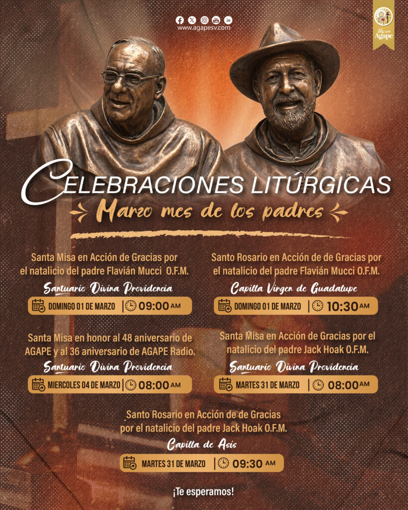 Declaramos Marzo, Mes de AGAPE, ¡𝐓𝐞 𝐀𝐦𝐨 𝐌𝐮𝐜𝐡𝐨 – 𝐁𝐮𝐞𝐧𝐚 𝐆𝐞𝐧𝐭𝐞! Mes de los Padres. En honor al 48 aniversario de AGAPE y al natalicio de nuestro fundador Fray Flavián Mucci O.F.M. y amado Fray Jack W. Hoak. O.F.M. Este período es dedicado a conmemorar y celebrar sus vidas, recordando momentos especiales y compartiendo sus filosofías, las cuales se basan en el amor incondicional y el servicio desinteresado a los demás, especialmente a los más desfavorecidos.